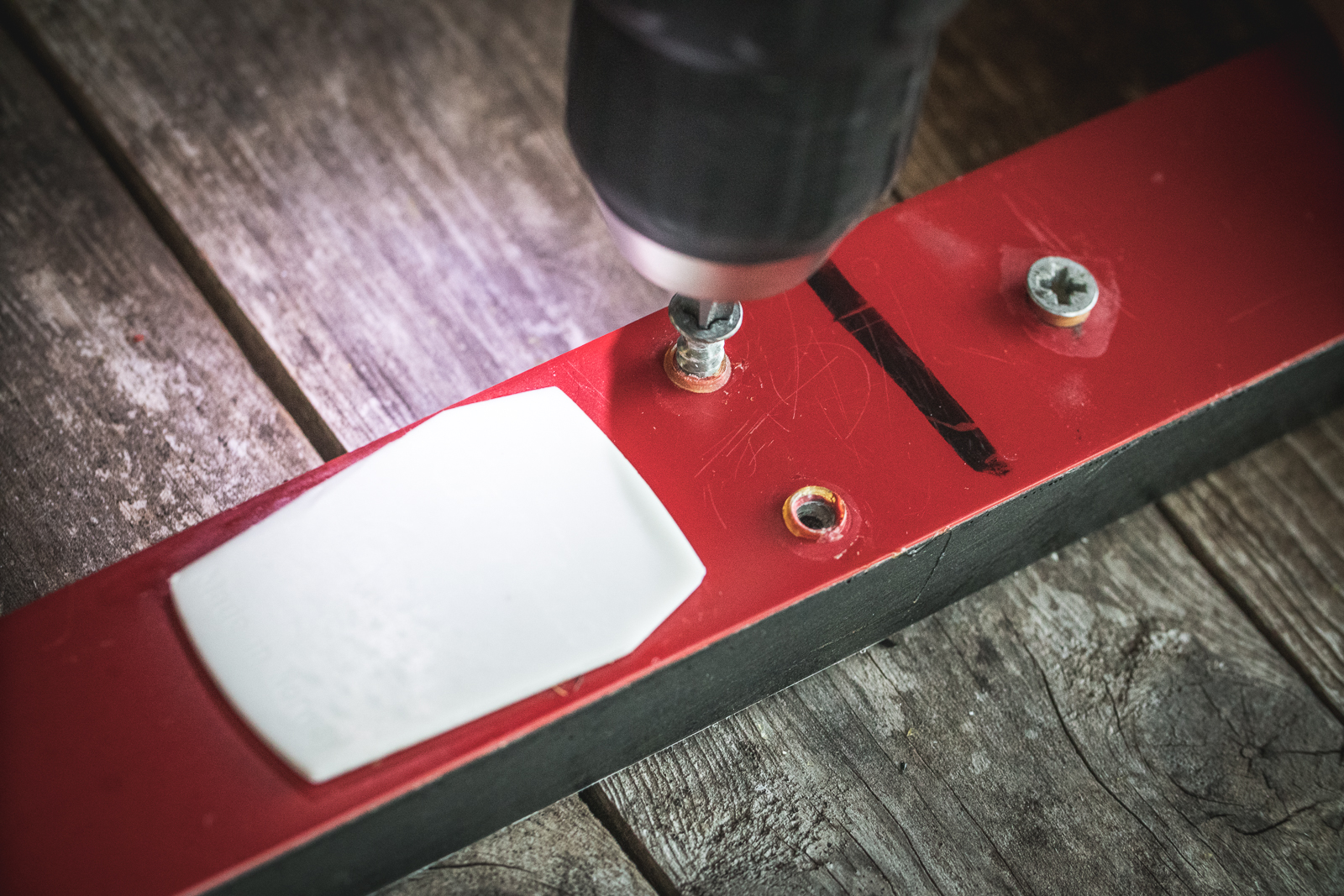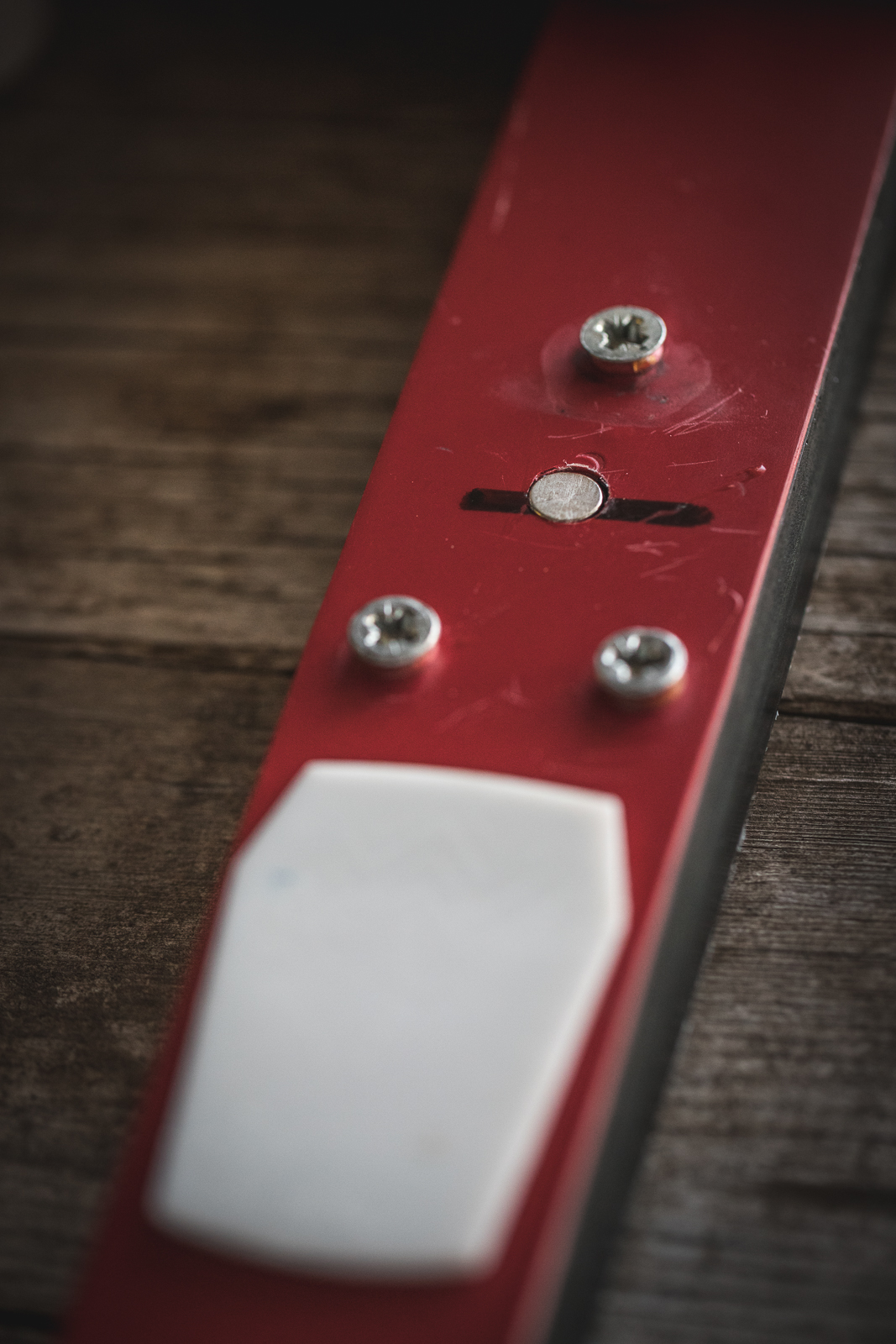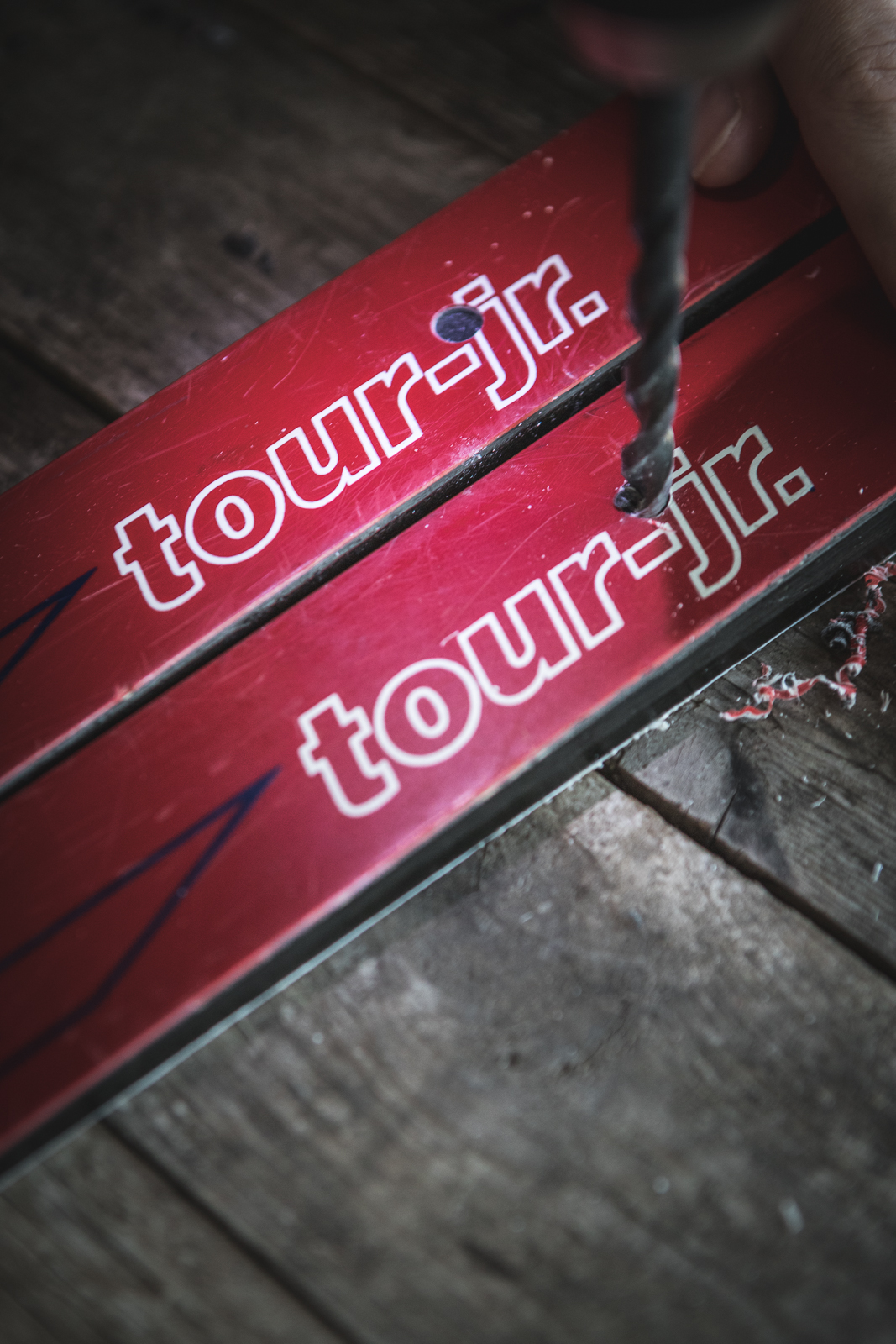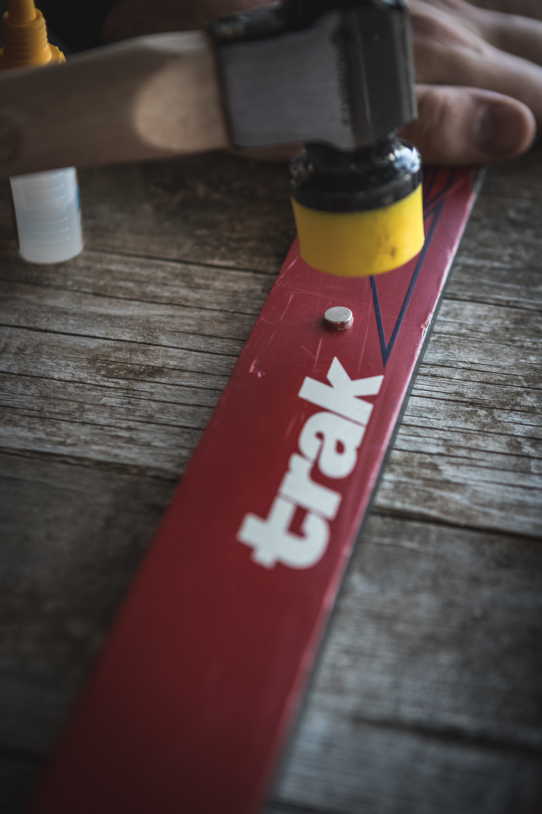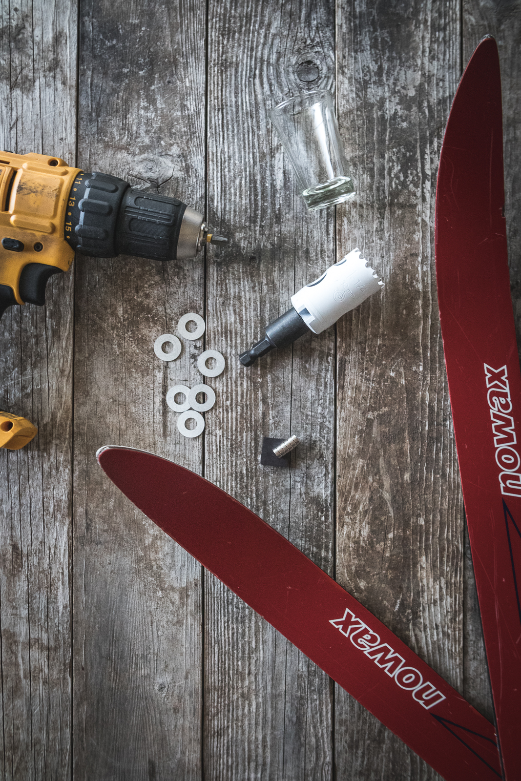 - Using the circular saw or drill bit and applying even pressure, drill down into the top of the ski to the height of one magnet (so the magnet will sit flush with the top of the ski when set inside). Do not drill all the way through the ski.