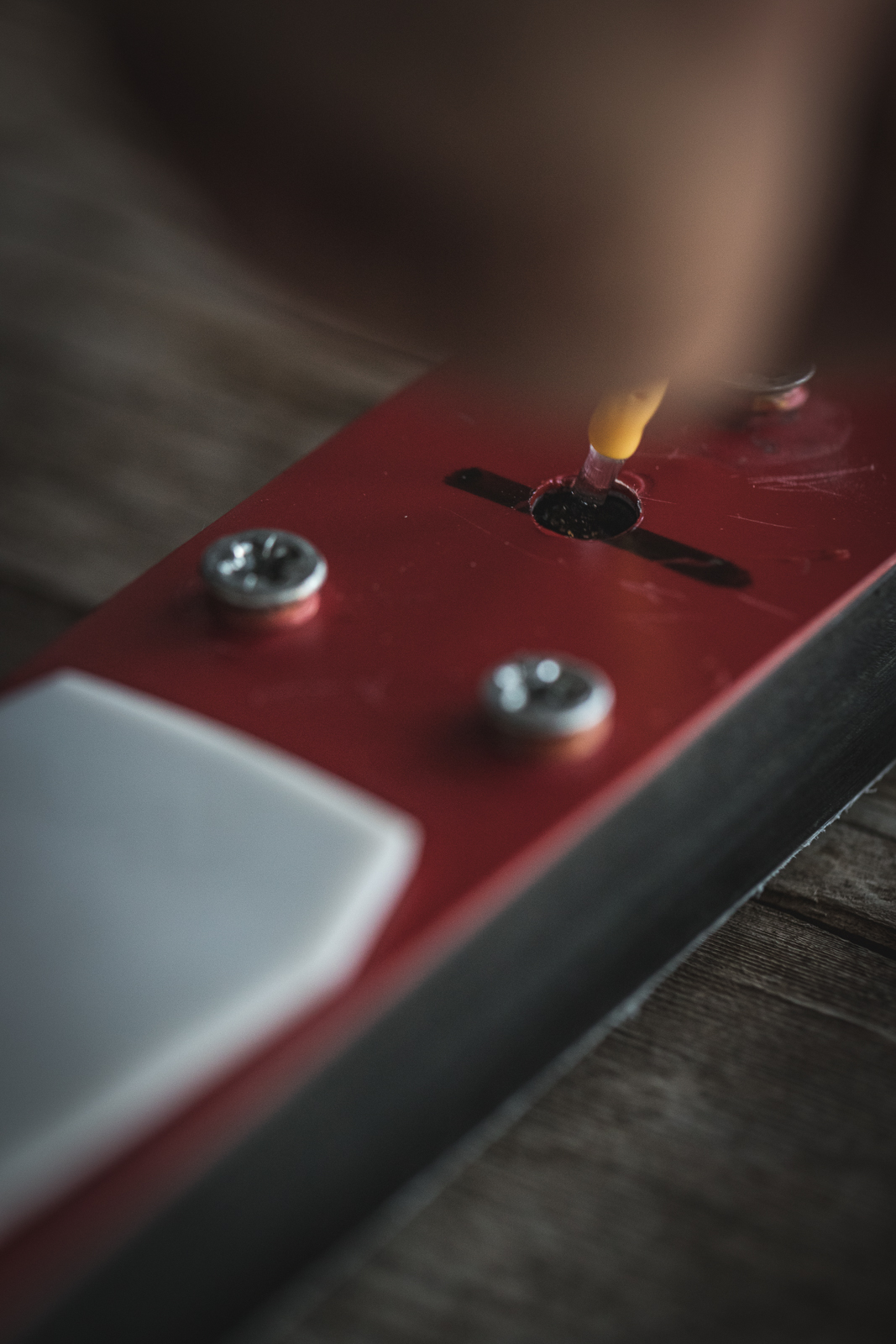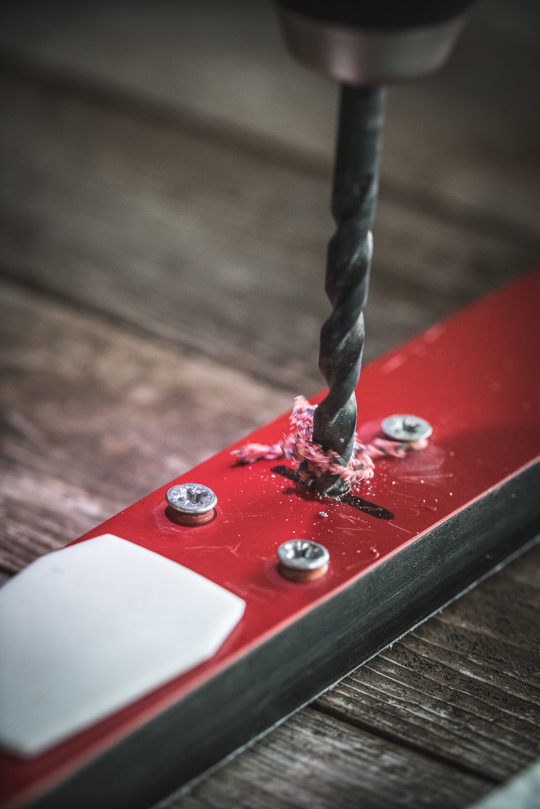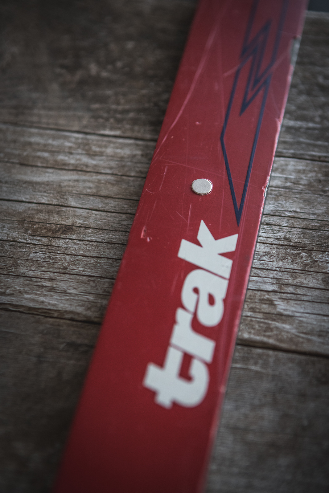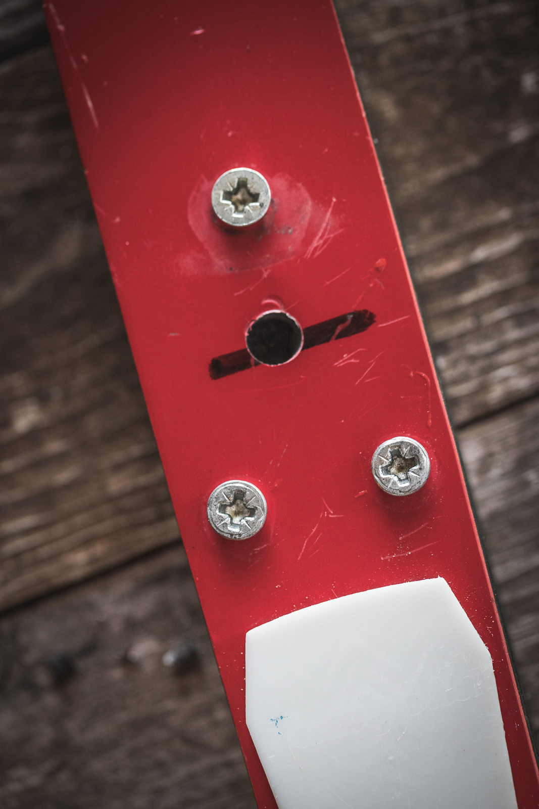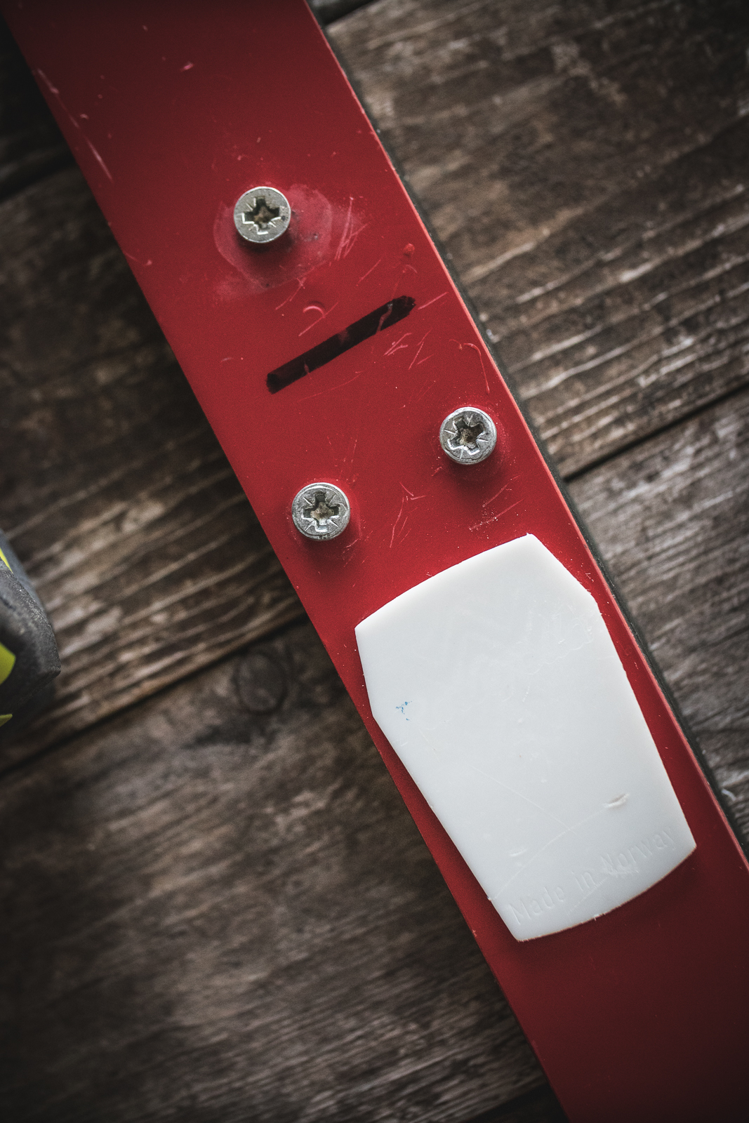 - Using the circular saw or drill bit and applying even pressure, drill down into the top of the ski to the height of one magnet (so the magnet will sit flush with the top of the ski when set inside). Do not drill all the way through the ski.