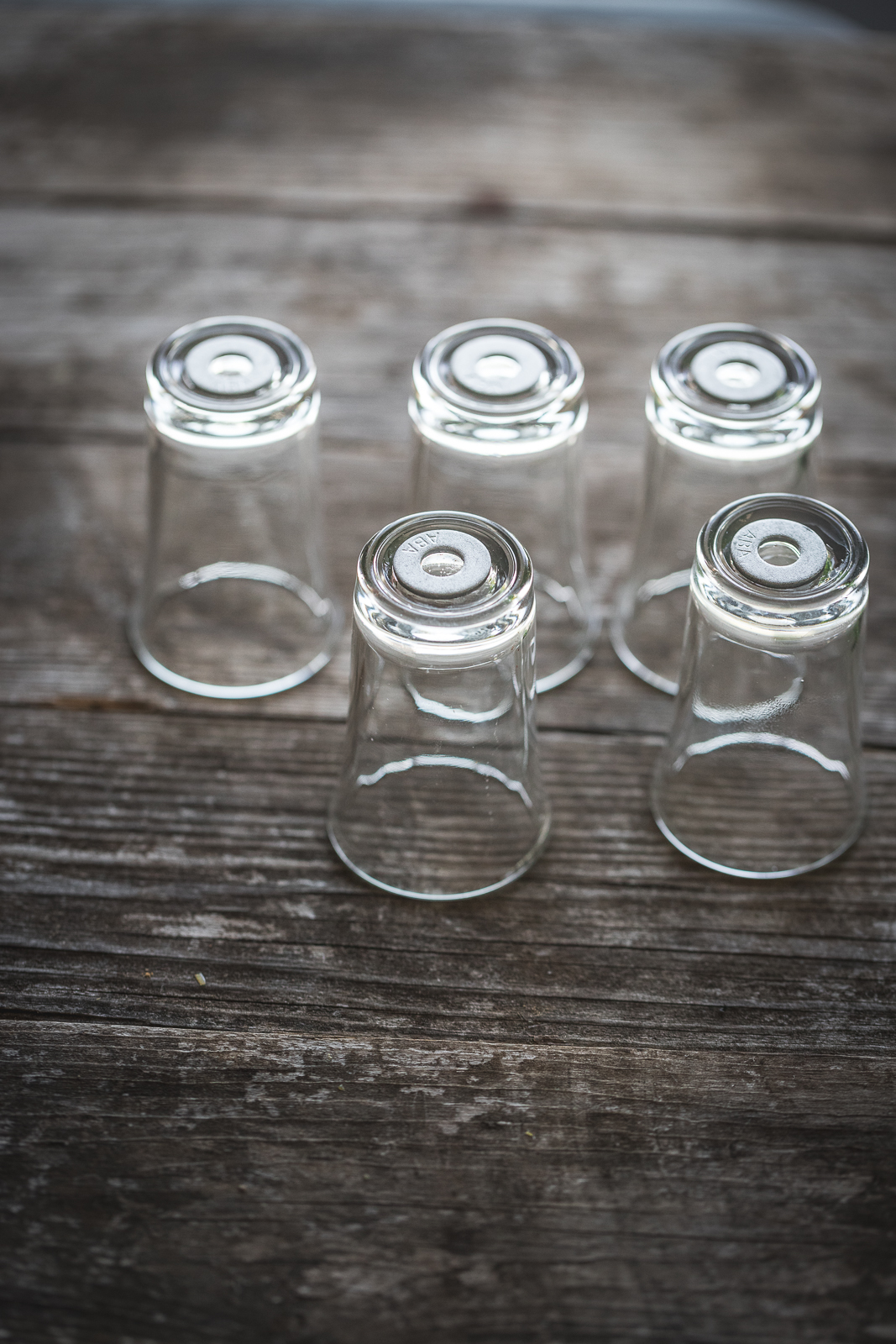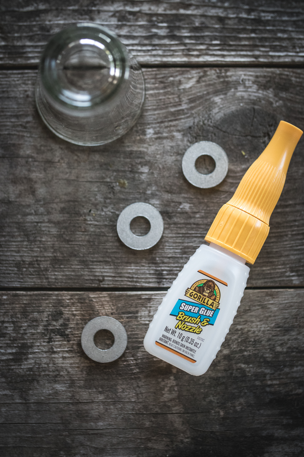 - Flip the shot glasses upside down. Place a dab of hot glue on the bottom of the glasses and press the washers down until set.