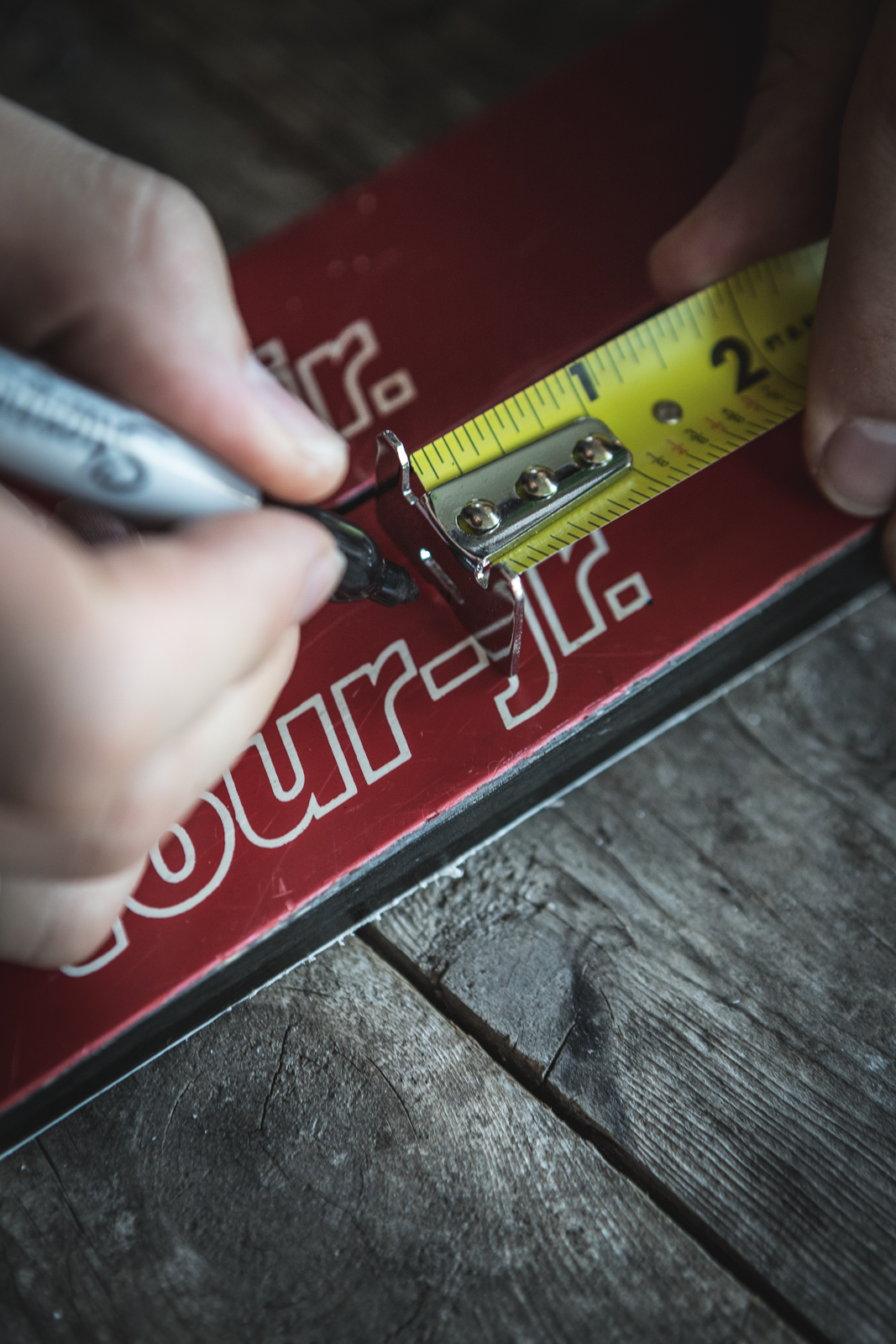 - Measure out each ski in three equal parts and put Xs or a dot in the center of each part. “X” marks the spot where you’ll drill insets for the magnets.