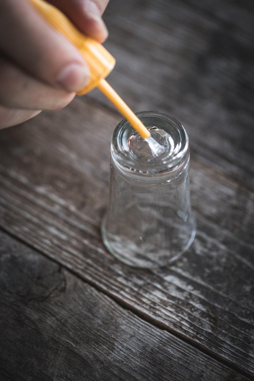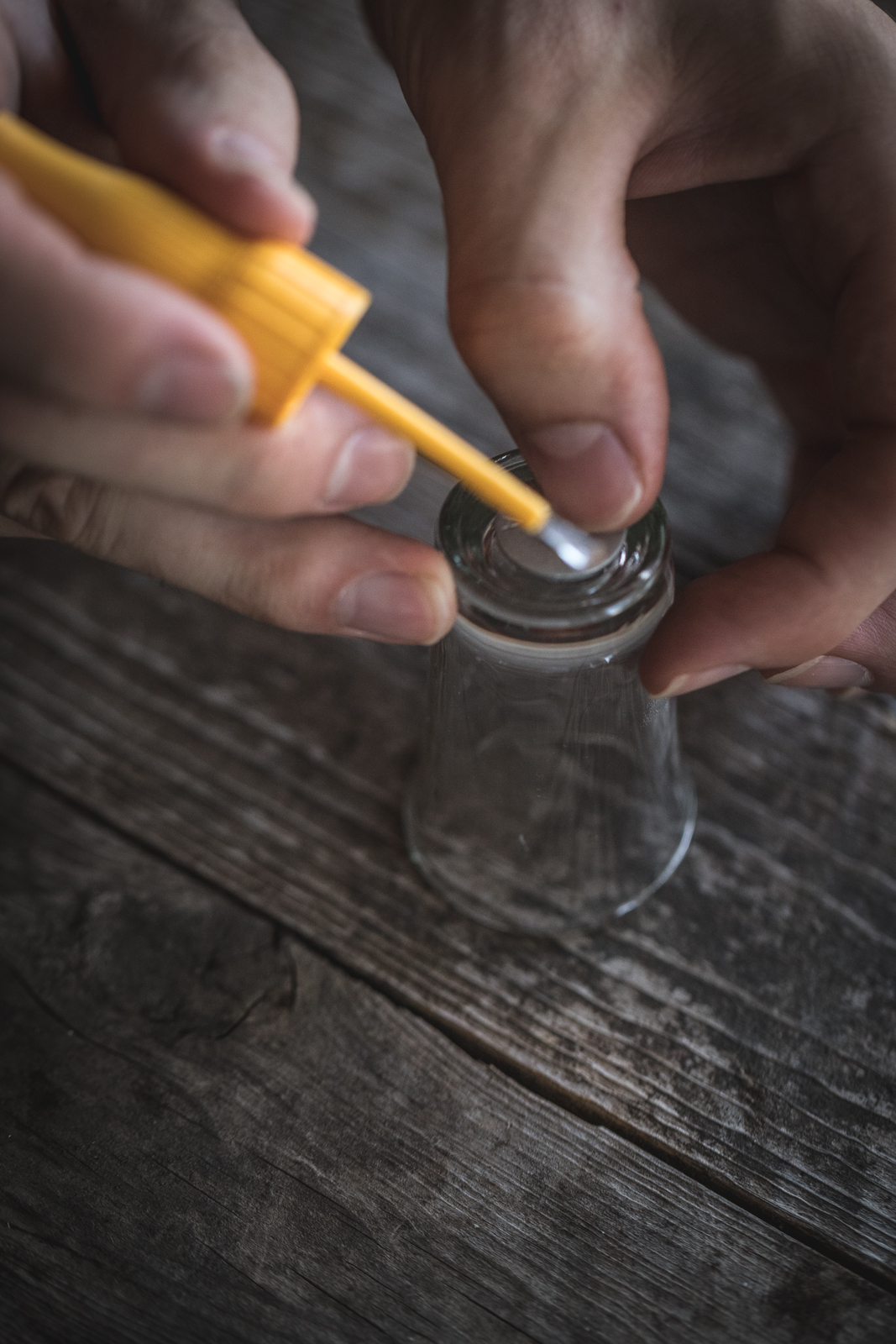 - Apply a small amount of glue to the bottom of each drilled hole.